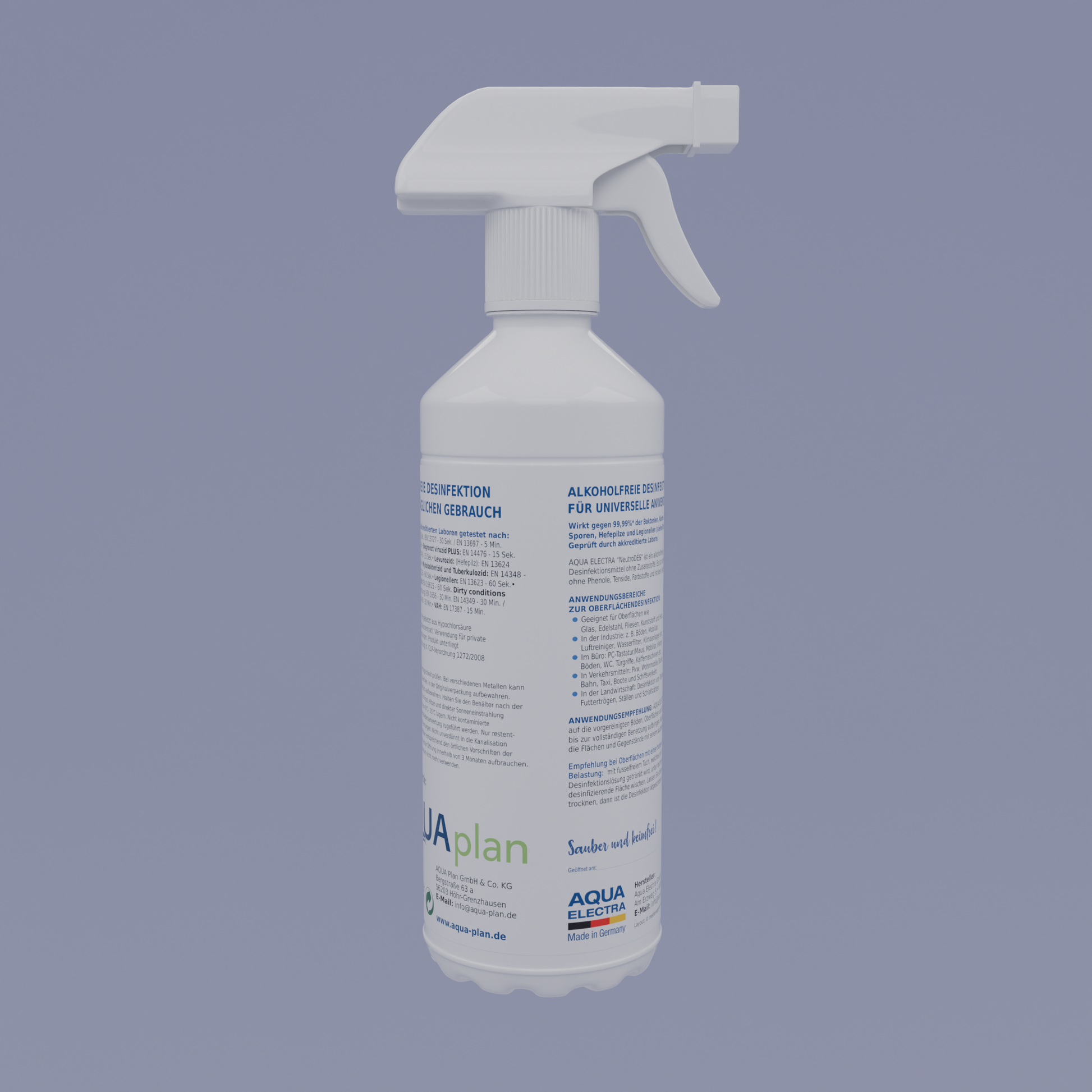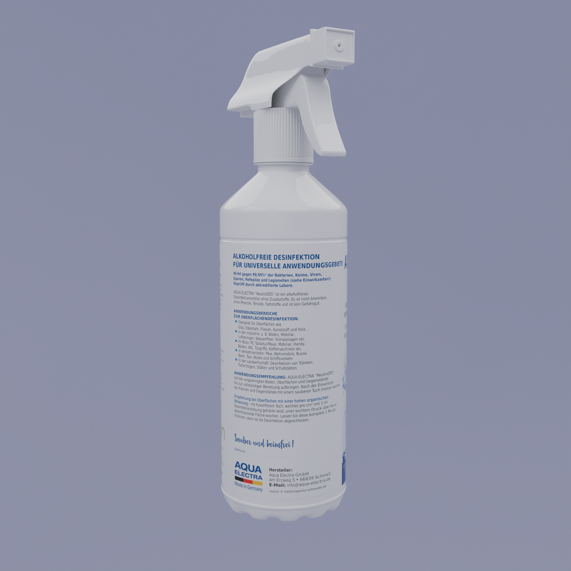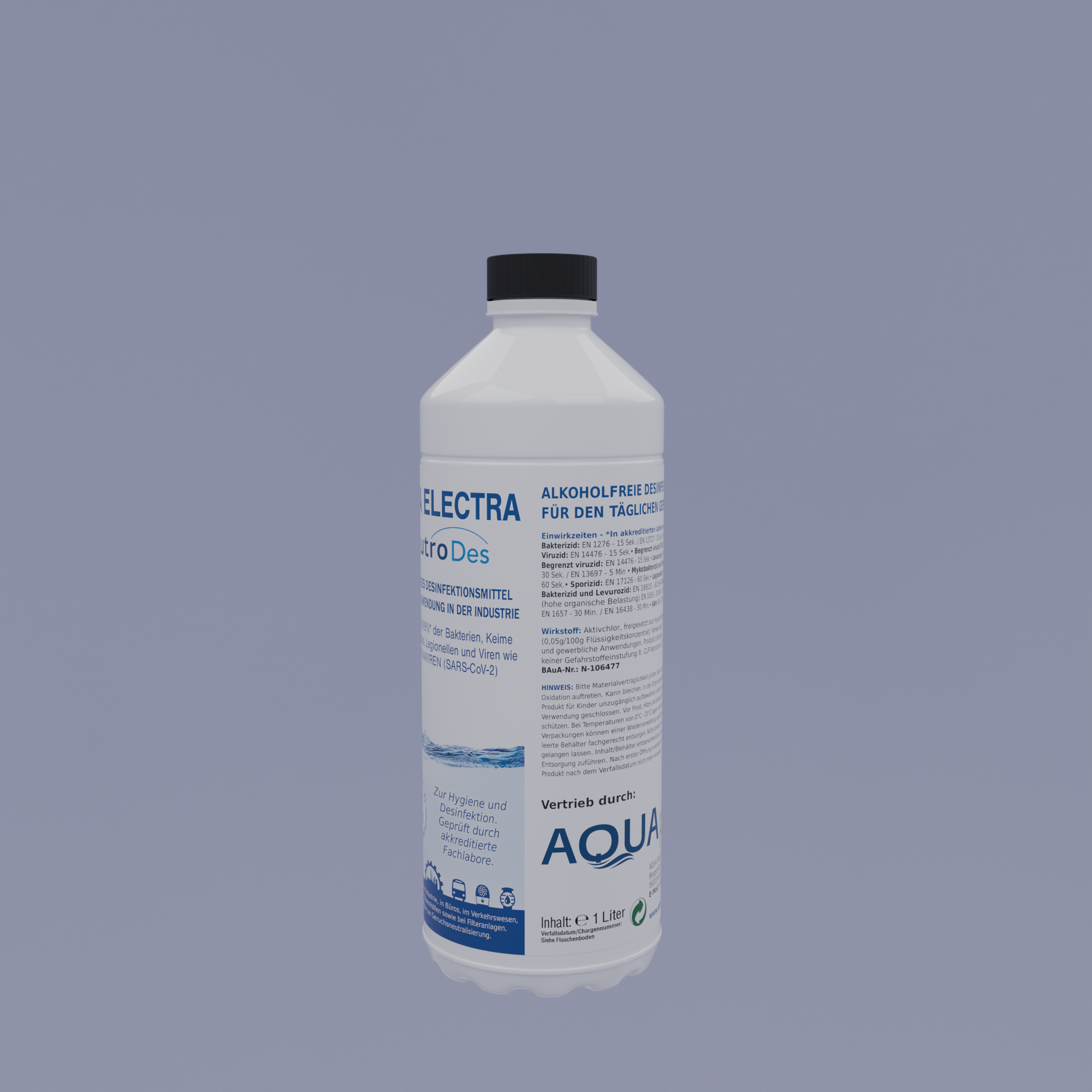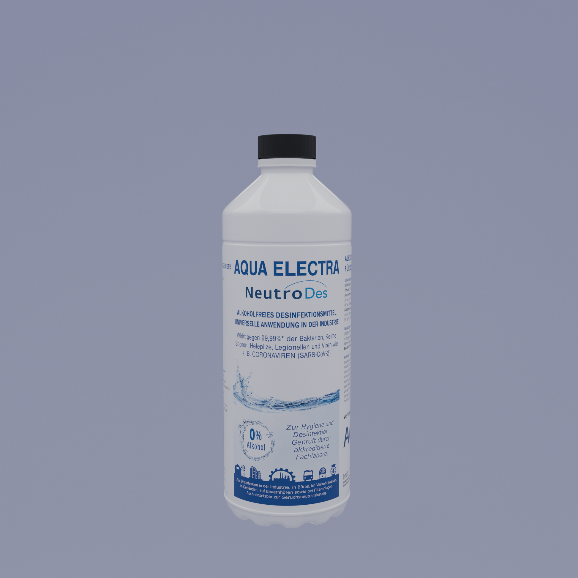 Aqua Electra NeutroDes ist ein gebrauchsfertiges Desinfektionsmittel, das speziell für Industrie- und Alltagsgebrauch entwickelt wurde. Es wirkt effizient bei der Oberflächenreinigung und mithilfe von Ultraschallverneblern. Die hochwirksame Formel bekämpft über 99,99 % der Bakterien, Keime, Viren, Sporen, Hefepilze und Legionellen. Dank der alkoholfreien, nicht brennbaren und biologisch abbaubaren Zusammensetzung ist es besonders sicher und umweltfreundlich.