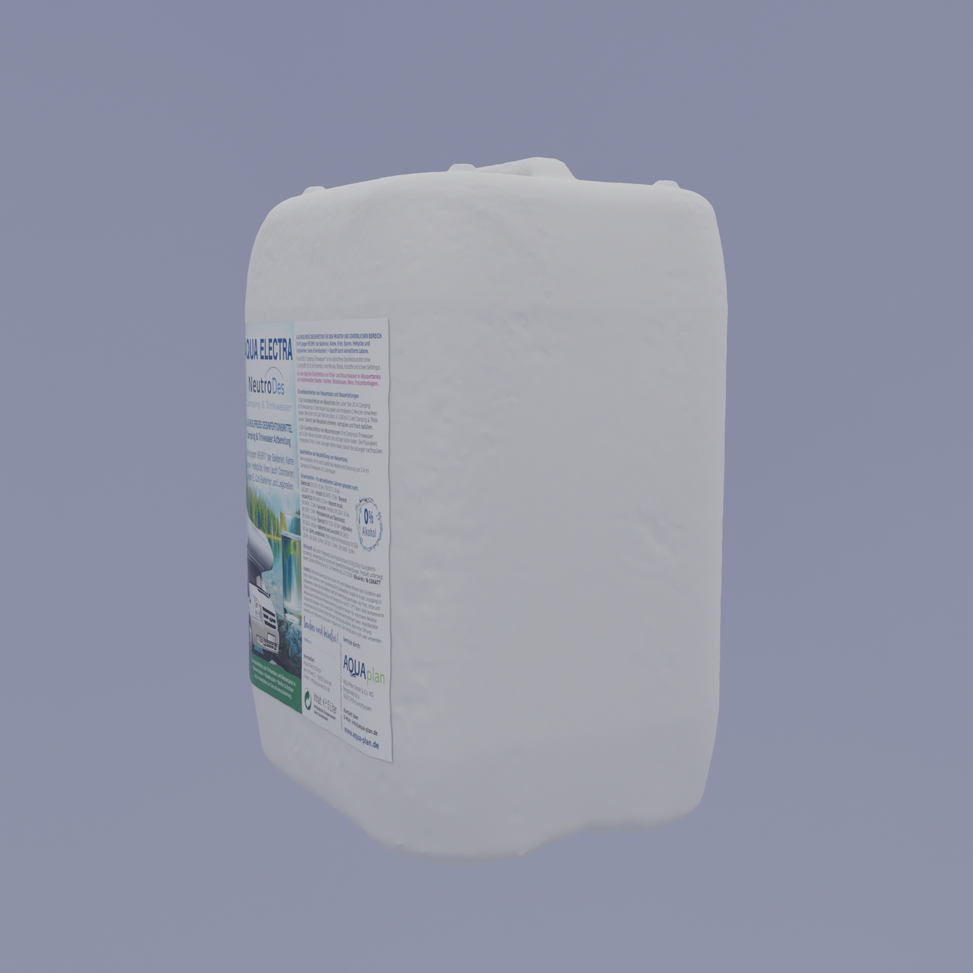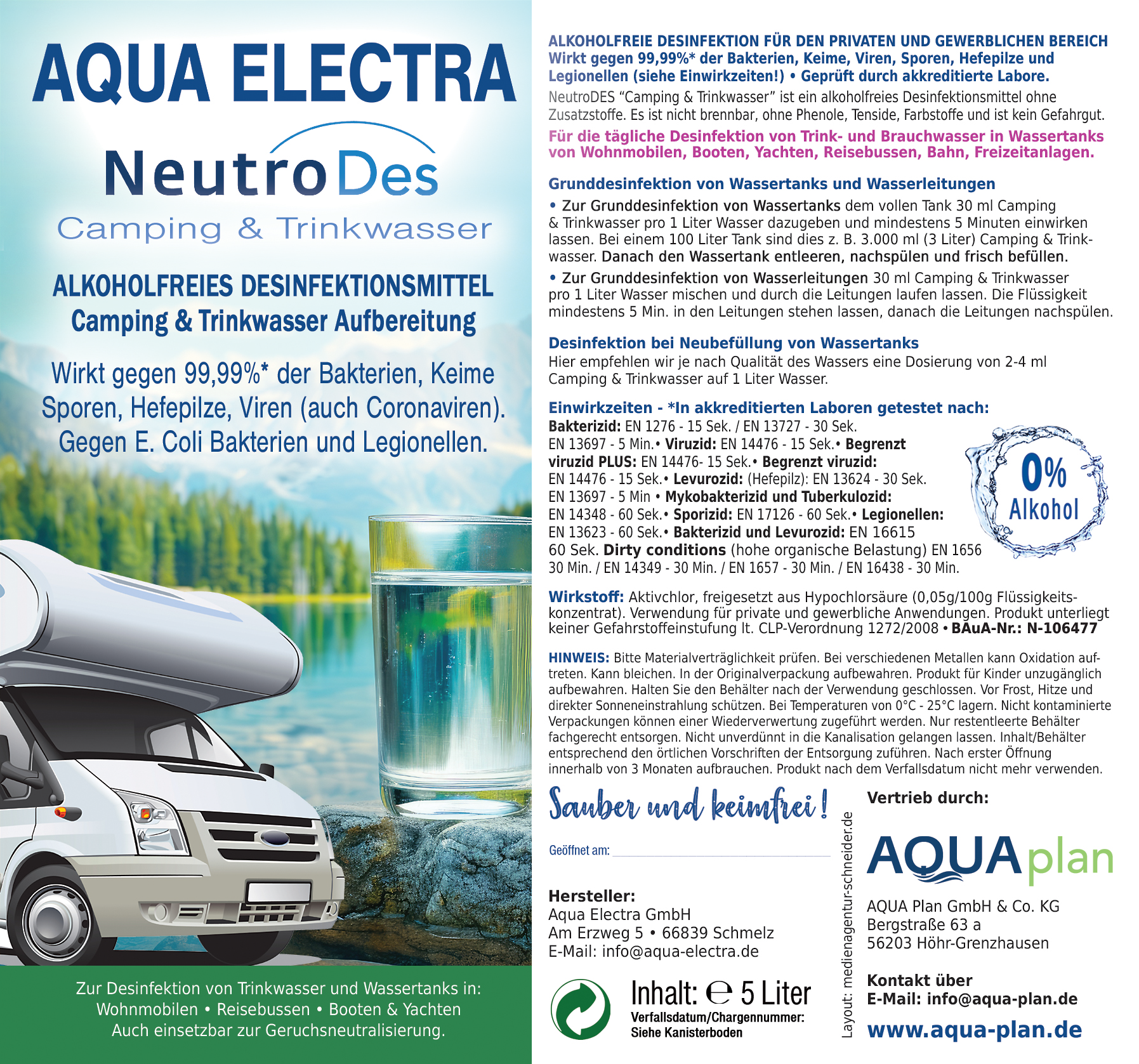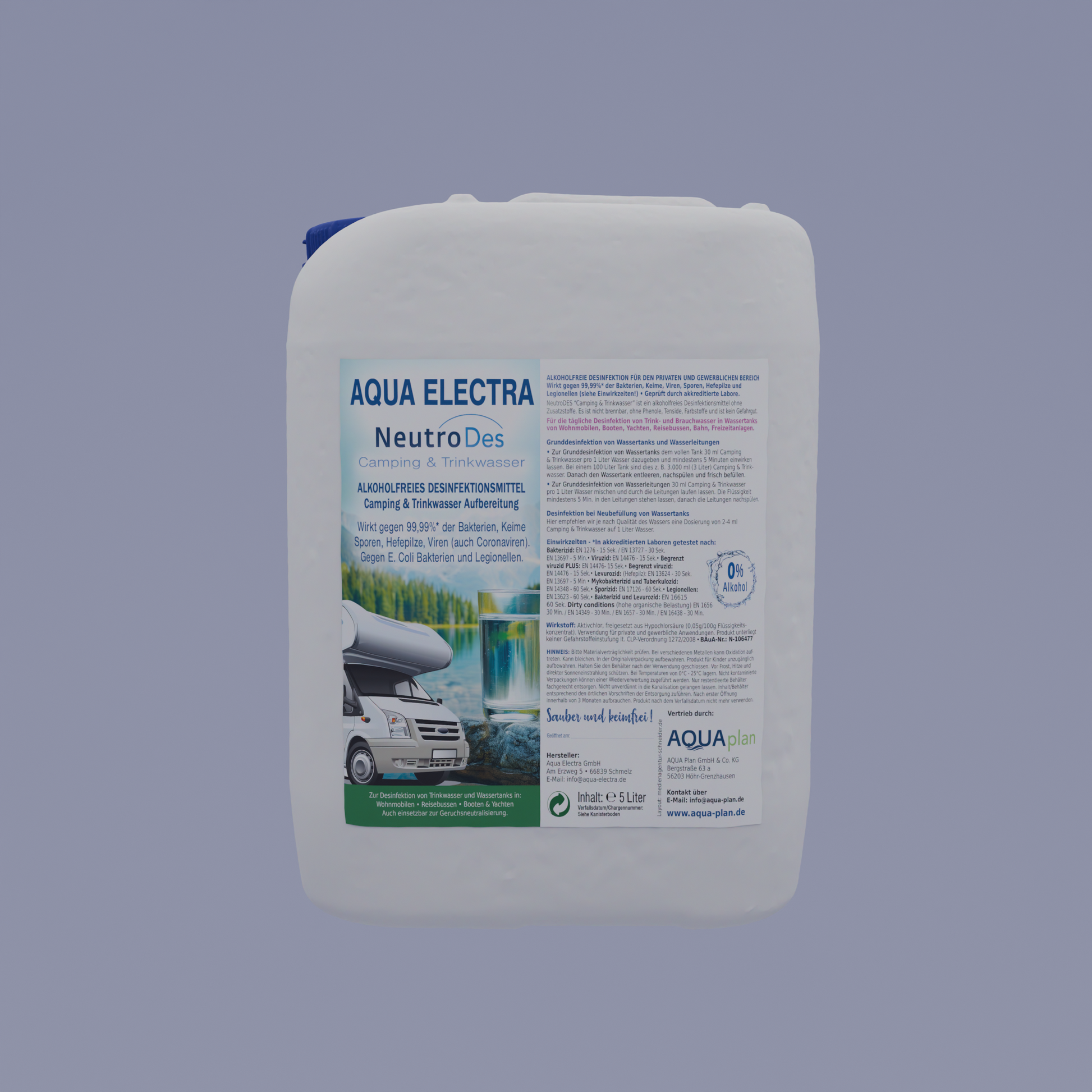 Aqua Electra NeutroDes ist ein gebrauchsfertiges, alkoholfreies Desinfektionsmittel, das speziell für den privaten Gebrauch und die Anwendung im Camping-Bereich entwickelt wurde. Es dient zur Desinfektion von Oberflächen und der Trink- und Brauchwasseraufbereitung. Die hochwirksame Formel bekämpft über 99,99% der Bakterien, Keime, Viren (inkl. Coronaviren), Sporen, Hefepilze und Legionellen. Dank der alkoholfreien, nicht brennbaren und biologisch abbaubaren Zusammensetzung ist es besonders sicher und umweltfreundlich.